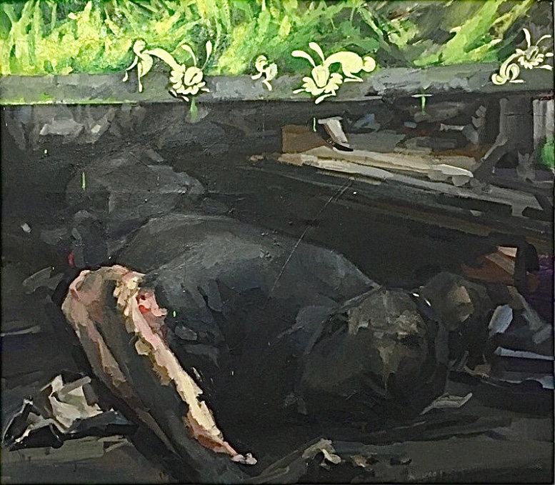 L’utilisation d’un motif ornemental renvoie directement à la tradition picturale ukrainienne, y compris à la peinture pétrokyvienne. La matière épaisse du coup de pinceau souligne la physicalité de la surface et supprime la distance entre l’image et le regardeur. L’œuvre est présentée comme un fait visuel, sans dramatisation ni intention moralisatrice.