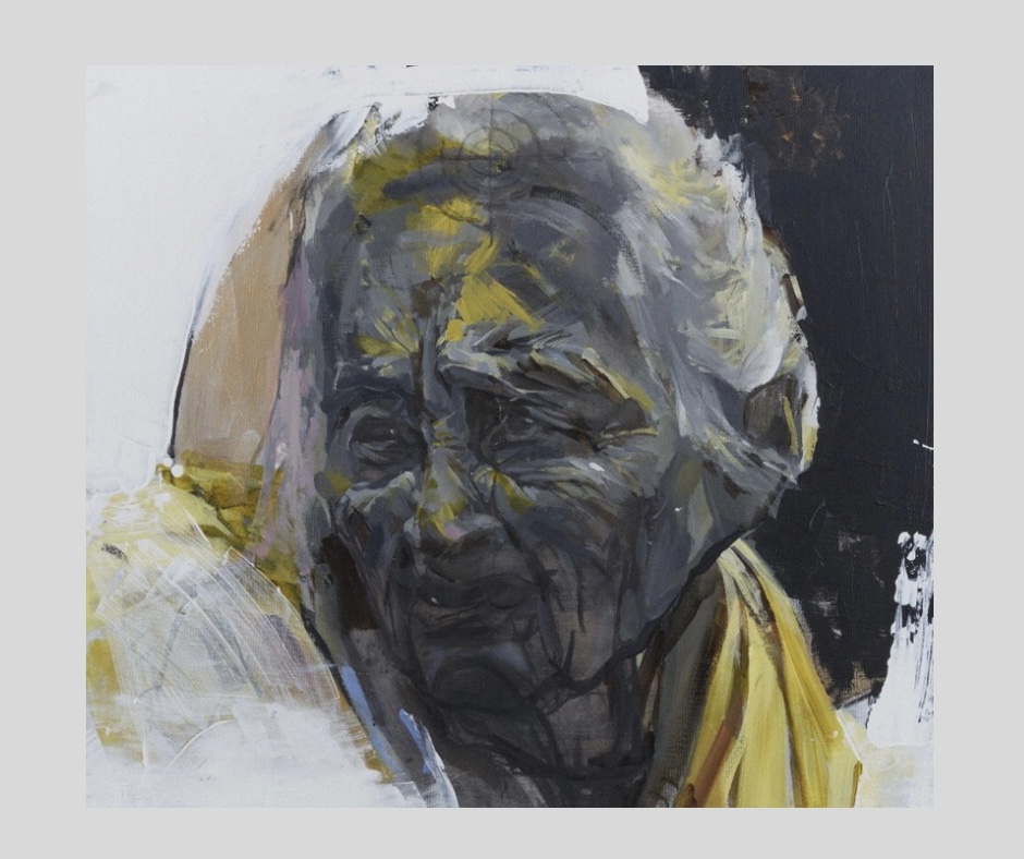 2022, ParisLe portrait dépasse volontairement les limites de la précision anatomique, tout en conservant une structure reconnaissable et une expression identifiable. La palette — masses de gris et de noir, accompagnées d’accents jaune-bleu — renforce l’authenticité et suggère une appartenance ukrainienne.