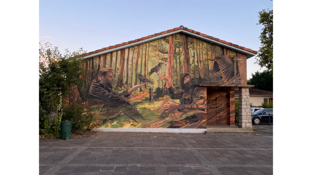 Fresque réalisée à Saint Paul-les-Dax dans le cadre du festival Muralis et grâce au collectif Kalos. Elle met à l’honneur les légendes et la nature Saint-Pauloises : La composition et les personnages sont librement inspirés du tableau La Visite de saint Antoine à saint Paul de Matthias Grünewald (vers 1412–1416). Deux personnages mystérieux symbolisant Saint Antoine et Saint Paul sont assis au cœur de la forêt, près de la mythique pierre de Tinon, réputée pour accueillir le sabbat des sorcières dès le Moyen Âge. Dans leurs mains, des corbeaux, en référence à l’oiseau du blason communal, qui, selon la légende, aurait apporté chaque jour un demi-pain à saint Paul ermite lors de sa retraite dans le désert.