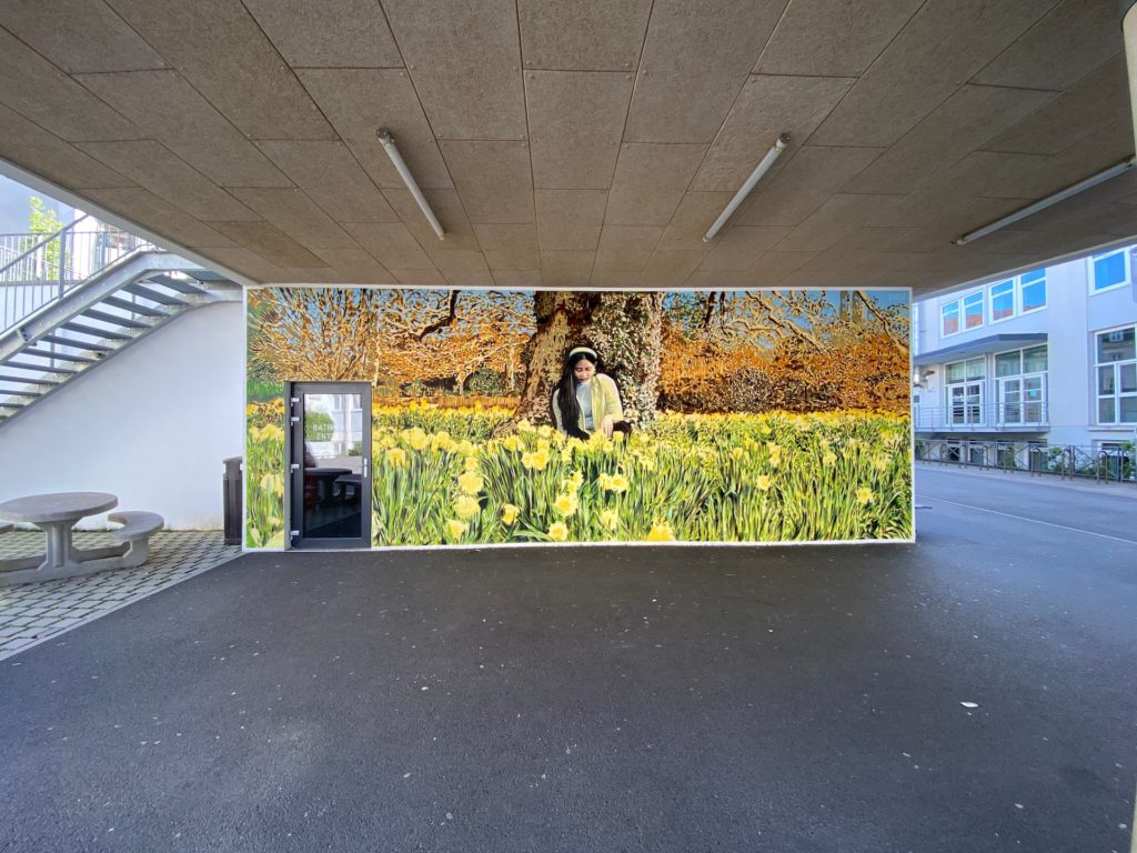 Narcissus, Fresque murale réalisée dans l’école Notre Dame de Strasbourg. Elle s’inscrit dans un travail avec les élèves de 1re option art plastique sur la thématique du paysage.