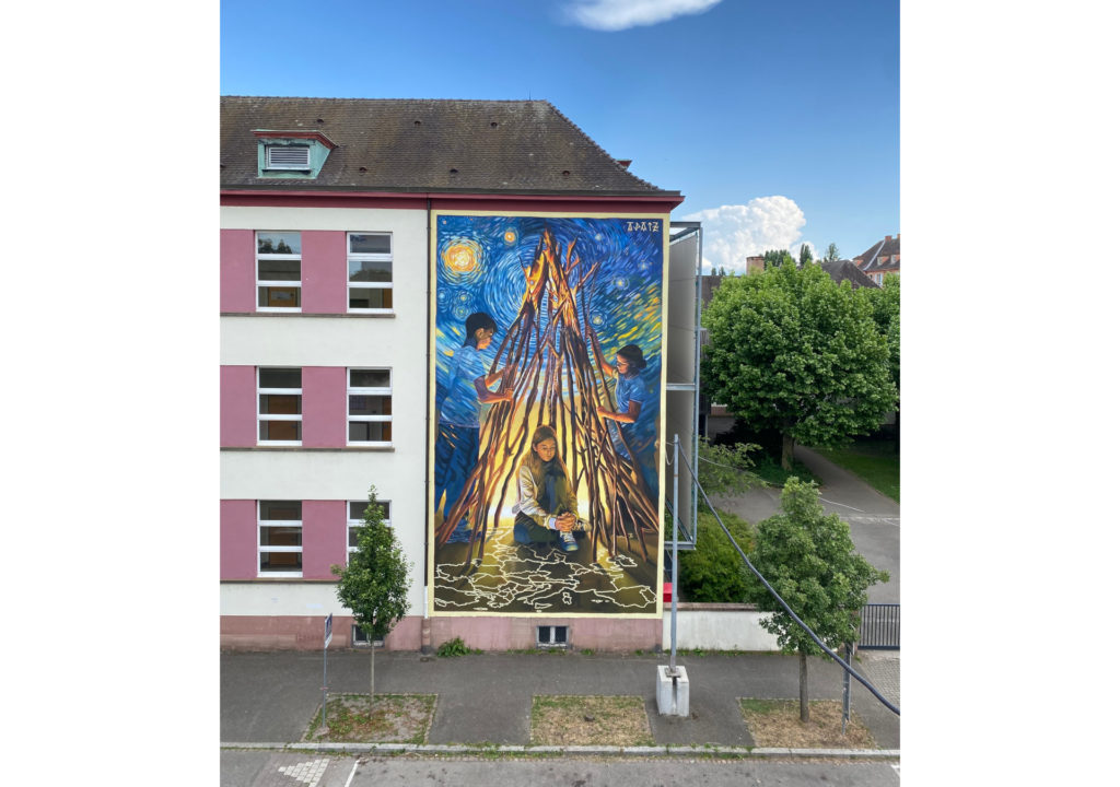 Fresque réalisée avec l’aide des élèves et le soutien des professeurs du Collège Vauban International à Strasbourg, dans le cadre de la Fête de l’Europe 2025. Intitulée « Un autre regard sur l’Europe », elle met en scène deux enfants construisant une cabane en bois, tandis qu’une troisième vient s’y réfugier — métaphore d’une Europe protectrice mais fragile. Les enfants incarnent l’espoir, la solidarité et l’avenir d’une union construite collectivement. Le feu, visible dans la partie haute de la cabane, symbolise les conflits, les guerres et les crises actuelles, comme le réchauffement climatique, faisant écho à la célèbre phrase de Jacques Chirac : « Notre maison brûle, mais nous regardons ailleurs ». La référence au tableau La Nuit étoilée de Van Gogh évoque les étoiles du drapeau européen. La carte de l’Europe y est représentée à l’envers, en référence à la projection de James Gall et Arno Peters ou encore à la carte inversée du géographe australien Stuart McArthur. Ce choix invite à s’interroger sur le rôle politique des cartes et remet en question nos représentations habituelles. Renverser la carte devient alors une manière de réfléchir à notre propre perception du monde. L’œuvre nous incite ainsi à changer notre regard sur l’Europe et à adopter une vision plus critique, poétique et solidaire.